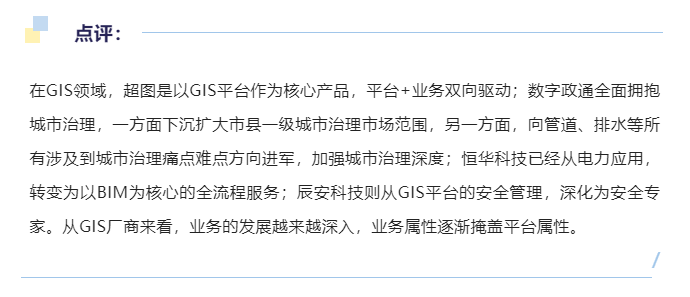 公司以GIS平台为核心,打造了大资源(主要面向自然资源行业,包括国土、规划、测绘等)、 大智慧(主要面向智慧城市、智慧园区、智慧设施等)、大环境(主要面向生态环境、水利、气象行业)、大国防四大业务线和解决方案。公司除了在GIS平台及技术方面继续创新之外,增长比较快的业务包括自然资源确权登记项目、信创项目、智慧园区业务、新型基础测绘与实景三维中国的底层支撑。同时,在国际化的运营过程中,做了比较多的尝试,展现了强大的品牌实力。数字政通的主营业务是专业智慧城市应用软件的开发和销售,并提供技术支持和后续服务,是国内知名度较高、市场份额领先的智慧城市应用软件开发商和全面解决方案提供商之一。数字政通在产品层面消息比较少,但是在智慧城市、城市综合管理服务平台业务、市域社会治理平台业务、城市大数据综合运营服务业务、城市市政排水管网智慧监管平台业务等围绕城市服务方面有非常大市场优势、场景沉淀和品牌影响。公司立足于电力行业,基于云计算、大数据、物联网、移动互联网、BIM、人工智能等技术和理念,为能源互联网建设提供全产业链一体化服务。公司的产品和服务主要面向电网公司、电力设计 企业、地方电力公司、配售电公司、智慧园区以及用能企业等用户。近几年,公司业务持续下滑,既有电力市场业务推进的因素,也有公司整体业务的战略转型阵痛,确立了“BIM平台软件及行业数字化应用和运营的服务商”战略定位,围绕BIM平台及软件、BIM设计咨询、基于BIM的资产数字化应用、基于BIM的大数据应用、BIM数字教育开展业务,面向行业依然是电力、交通、水利。公司是国内公共安全应急与城市安全领域的领先企业及国际化公共安全产品与服务供应商,主要从事公共安全软件、公共安全装备的研发、设计、制造、销售及相关服务。公司定位的公共安全产业涉及自然灾害、事故灾难、公共卫生、社会安全事件四个主要方面,当危及大多数人的生命健康和财产安全的突发事件发生前后或发生时,为此类事件的预防与应急准备、监测与预警、应急处置与救援、事后评估提供产品和技术支撑及服务。随着国家应急管理部的成立,围绕安全管理的产业迎来大的发展机遇,在近两年自然资源风险普查以及其他各类安全普查等大专项的推动下,安全管理行业持续蓬勃发展。但是任何一个综合平台转向专业平台,都不可避免要成为行业专家,成为行业公司,从辰安在安全各方面的技术投入可见一斑。