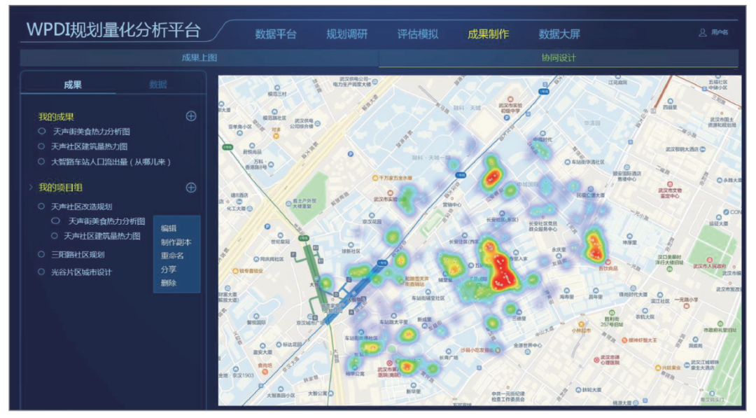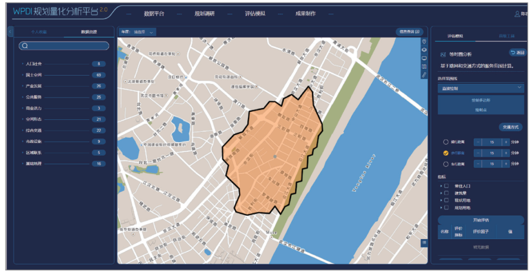 图1 量化分析平台总体框架图 3.2 数据体系建设 3.2.1 多源数据类型 全面、准确、多元的数据是支撑数字化转型的基础。因此,数据汇聚是量化分析平台的基本和首要功能。武汉市规划研究院围绕规划人员的工作重点和使用习惯构建了“1+8”的数据体系,其中“1”是指国土空间规划数据,“8”是指城市规划和研究中所需要的八类社会经济数据。国土空间规划数据按照土地全生命周期分为基础现状、规划成果和实施监督三类,社会经济数据则包括人口社会、房产建筑、公服设施、综合交通、市政设施、产业经济、对外联系和生态环境。从数据类型来看,国土空间规划数据属于权威、准确的传统数据,主要来源于自然资源和规划系统,而社会经济数据既包括行业主管部门的权威数据,也包括互联网、LBS等大数据,多源数据融合共同构成了支撑规划量化分析平台的数据体系。数据体系的建设是数字化转型的坚实基础,也是一个长期持续的过程,目标是实现数据的全周期和全覆盖。 3.2.2 数据的有效利用 数据资源的丰富只是基础,数据的有效利用才能对数字化转型形成有效支撑,武汉市规划研究院量化分析平台围绕“让数据用起来”进行数据治理和功能设计。为了让数据能用、好用,武汉市规划研究院建立院内统一的数据标准,以数据的标准化保证数据的一致性和可复用性。数据以空间单元为基准,加上时间维度,使其彼此之间能够关联、叠加。按照数据中台的理念,数据的利用应以业务或者用户为中心,根据工作需要来组织数据,而不只是按照数据的分类进行罗列和叠加。以信息查询为例,量化分析平台在传统属性查询的基础上,以控规地块为基本单元,对地块的全生命周期信息进行有效组织,同时计算地块的人口、用地、建筑等常用指标,力求给予用户全面、清晰、高效的“一站式”数据服务,这种设计从传统的数据检索工程化思路向以用户为中心的思路转变。在这种转变下,IT人员既需要系统梳理土地用途管制的完整流程,也要了解规划人员的使用习惯,使数据应用方式更贴近业务,这也是数字化转型背景下信息化部门工作方式应该做出的转变。 在量化分析平台的具体功能设计上也突出了“用数据”的目标。一是空间计算服务化。将常用的空间裁切、统计方法作为标准化服务,提供常用的行政区划、规划单元以及任意绘制单元的计算功能,同时支持项目范围线的上传计算,赋予普通规划人员基本的数据获取能力。二是对接传统的线下工作模式,提供所需数据的个性化导出,可结合项目范围筛选合适的数据,并可将其导出为空间数据或者表格数据,方便规划人员使用。三是提供在线协同的线上工作模式,使数据获取、分析、出图、分享均能在线完成,进而将项目的数据分析成果、专题图都存入云端数据库,持续丰富全院的数据资源(图2)。通过量化分析平台的数据体系建设,武汉市规划研究院逐步形成了一个全院统一的数据中心,统一标准、统一维护、统一服务,使其成为数据中台的能力输出载体。 图2 在线协同设计展示图 3.3 工具体系建设 提高效率是量化分析平台建设的目标之一,平台将规划工作中具有一定共性特征的数据应用进行工具化,打造系列便捷、实用的工具,切实提高规划工作效率。一是“一键式”数据工具,即围绕某个应用需求,一键生成所需要的数据报告。例如,一次性提取项目范围内的各类规划信息,即一键统计项目范围内的人口、用地、建筑、设施等数据,便于规划师全面了解各层级、各专项规划的要求,实现多规协调,为现状分析提供准确的数据支撑;一键生成PPT格式的数据报告,大大节省了规划师多方查证、收集基础数据和绘图对比的时间,当然这也依赖于统一可靠的数据基础。这种“一键式”数据工具具有批量、自动化的数据提取、处理的能力,可以根据业务需要进行灵活的组合、搭配,具有较强的实用价值。二是将较专业的GIS分析功能转化为标准化工具,如缓冲区分析、等时圈分析等,有效地降低操作的门槛,有利于规划人员的使用。以等时圈分析为例,该项分析常用于15分钟生活圈等规划,规划人员也知道基于真实路网和交通方式的分析更加科学,但苦于不会操作,仍简单地采用缓冲区分析等方法。武汉市规划研究院量化分析平台集成了等时圈分析工具后,规划人员只需选择起始点、交通方式及交通时长即可获得分析结果,操作简便(图3)。 图3 等时圈分析工具展示图 3.4 模型体系建设 规划技术方法创新的核心是算法模型的应用,通过对现状进行客观评估、对规划方案进行模拟推演,提升规划的科学性,这也是武汉市规划研究院近年来的主要研究方向之一。武汉市规划研究院量化分析平台是科研成果转化的平台,以软件工程的方法实现规划模型的算法逻辑,打造工具化应用,从而实现人机协同的智慧规划。目前,武汉市规划研究院量化分析平台主要运用了以下三种模型。 一是基于指标计算式的模型,即在指标计算的基础上对比相关规范值或目标值,从而得出相对客观明确的结果,改变传统的主观印象或模糊判断。可评价的指标有的是传统指标,如人均面积、密度、服务半径等,有的则是创新指标,如基于图像识别技术的街道品质指标、天空率、绿视率等。相关规范值参照国家或行业标准规范,如住建部发布的《城市居住区规划设计标准》对居住区10