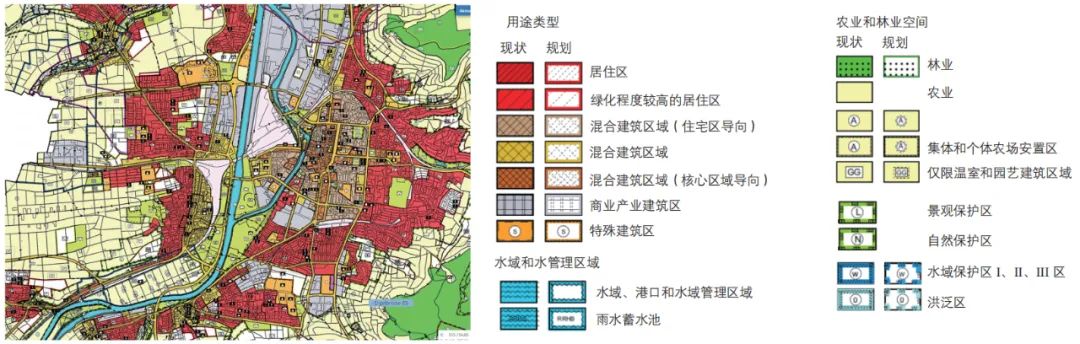 在德国的空间规划体系中,联邦和州并不直接介入国土空间的图斑划定工作,仅对发展与保护的重要空间进行结构性示意,开展空间用途管制的规划载体主要是地区规划和市镇土地利用规划。地区规划中通常包含以1∶200000比例尺绘制的区域秩序和发展结构图(Strukturkarte)和以1∶50000比例尺绘制的空间利用规划图(Raumnutzungskarte),后者以功能叠加政策的分区形式表达地区层面的空间使用设想(图9)。市镇土地利用规划通常在1∶10000比例尺的土地利用类型图中划分土地使用功能分区(图10)。换言之,地区规划向地方规划的分区传导大体遵循由粗到细的原则,但也并非严格的“母集”向“子集”的闭合传导关系。城市区域建设空间的传导中,市镇规划与地区规划划定的建设空间范围较为一致,市镇土地利用规划对地区规划中的功能分区进行类型细化。非建设空间的传导则较为复杂——除由专项规划设定的保护性边界外,地区规划中仅表达农业、林地等非建设空间要素的保护或控制结构,如区域绿色走廊、绿色节点、自然保育与景观维护区等,而地方规划中则需进一步细化为要素的功能分区,因此二者的空间范围并不完全一致或对应。正如地区规划中的说明所言,“空间使用规划图中的图形表示是概括的,而非基于地块(图斑)的,仅表示目标空间区域”。