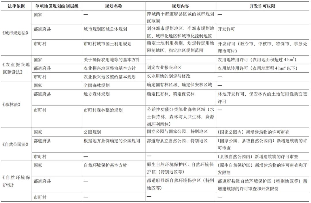 表3 日本国家、都道府县、市町村层面编制的单项地区规划类型、内容与开发许可权限