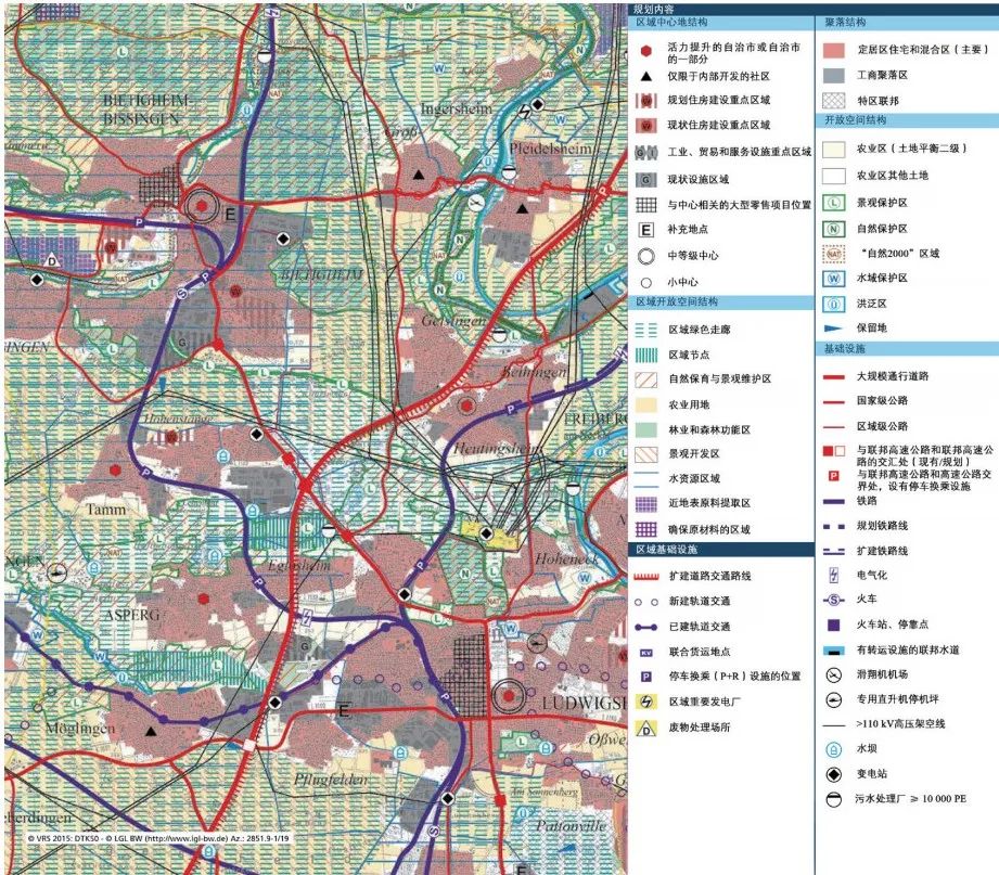 德国依托中心地体系规划,在州级和地区规划中提出了不同类别中心地的公共服务配套目录与布局要求。在地区规划的空间表达上,以点状要素形式表示出各中心地的工业贸易与服务设施重点区域、住房重点建设区域等,但不作具体的设施布局规划;针对基础设施工程,主要表达区域内的交通系统和各类线性基础设施网络(图11)。