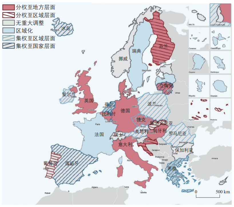 规划权力的垂直划分体现了上下级政府对空间治理权力的博弈,主要体现在空间规划的编制审批、实施监督的层级治理过程。欧盟研究了欧洲32个国家的空间规划体系在2000—2016年的演变后发现,最有影响的一个变化趋势是规划权力逐渐由国家向次国家级和地方一级的分权(decentralization)(图1)。典型案例如英国,通过规划体系的整合将确定城乡发展与开发管控的事权直接下沉至地方政府,中央政府则通过规划督察和基础设施建设两种机制确保地方规划符合中央政府的发展目标和政策要求;即使在以层级式规划著称的德国,国家层面在空间规划中的影响作用也在逐渐弱化,表现为国家通过赋予地方政府制定规划法律文件的权力增强地方规划编制内容的自主性和灵活性。