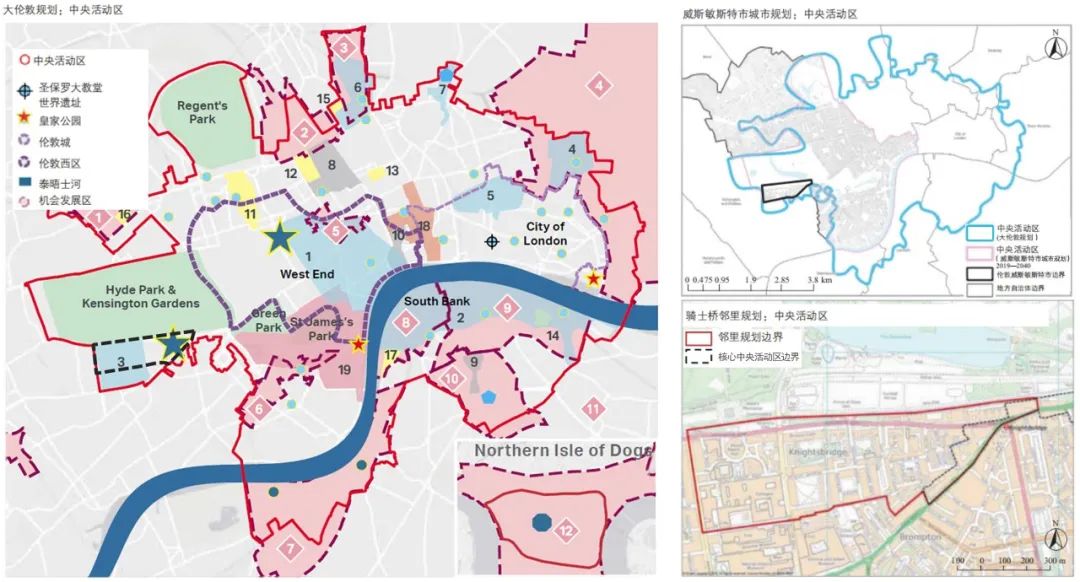 注:大伦敦规划中的中央活动区边界在威斯敏斯特市城市规划中得以传导,并结合实体地域进行了边界的优化,更低一层级的骑士桥邻里规划则对中央活动区的边界予以落实并细分出其核心范围。