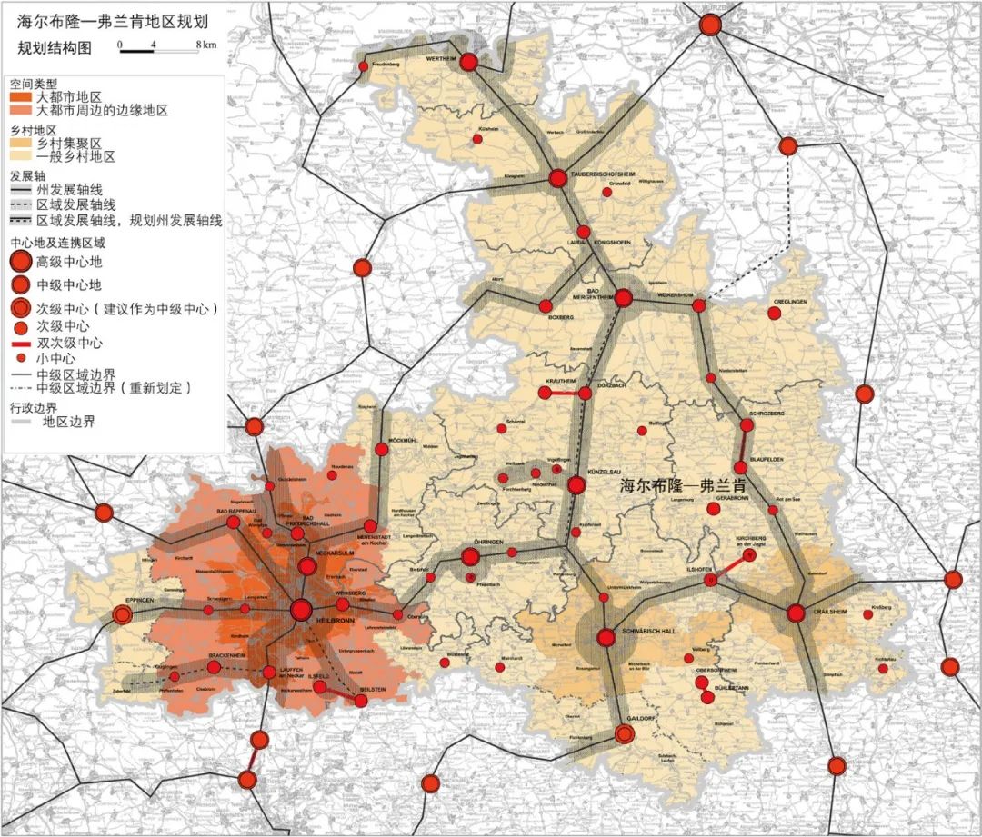图5 德国地区规划中的空间类型与中心地结构规划(以海尔布隆—弗兰肯地区[Heilbronn-Franken]规划为例)