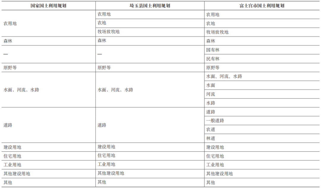 表2 日本国家、都道府县、市町村三级国土利用规划中土地使用分区指标设立层次比较(以埼玉县、富士宫市为例)